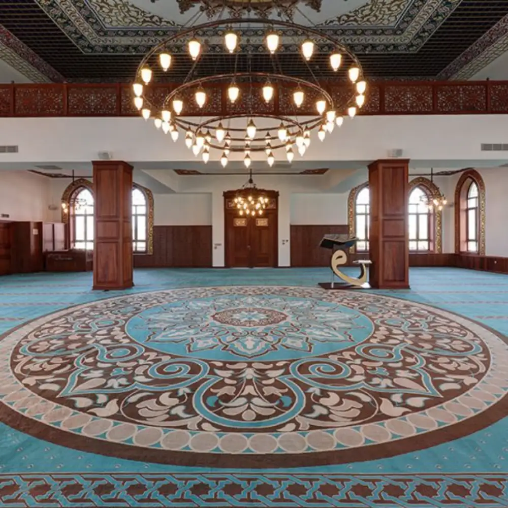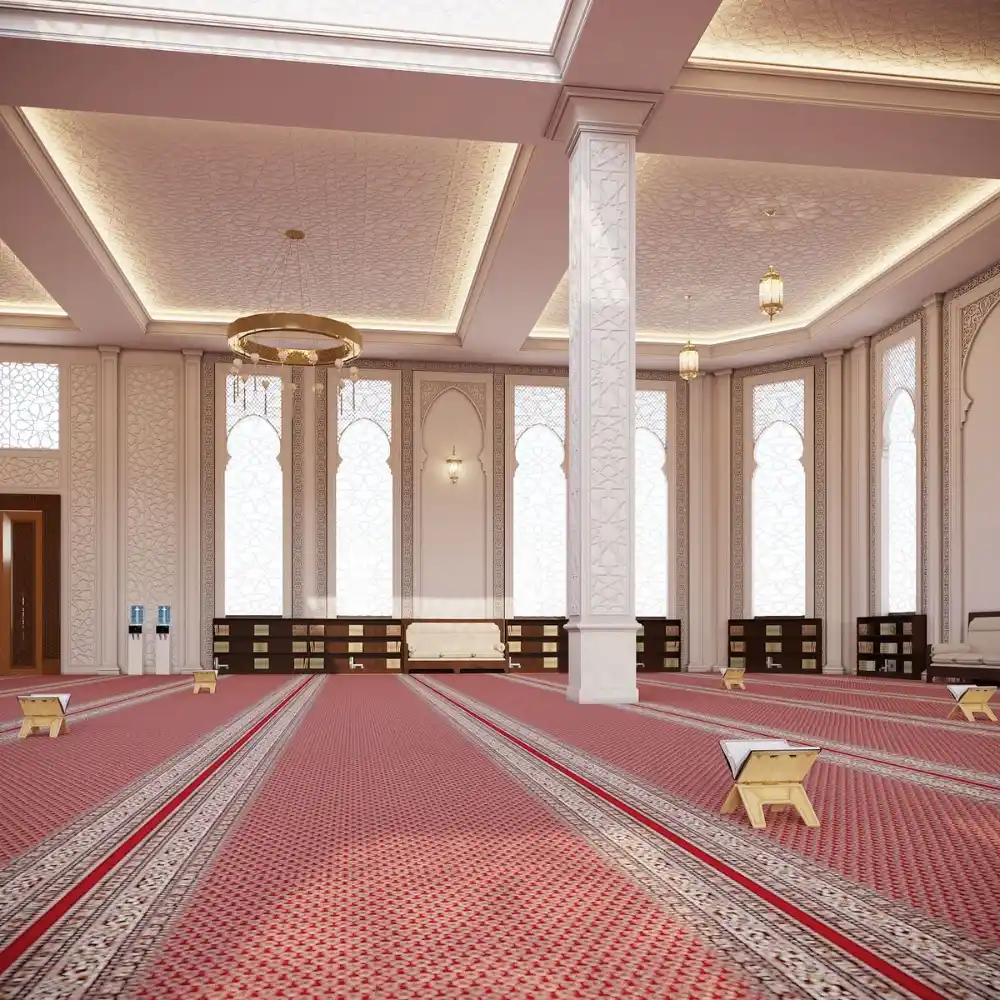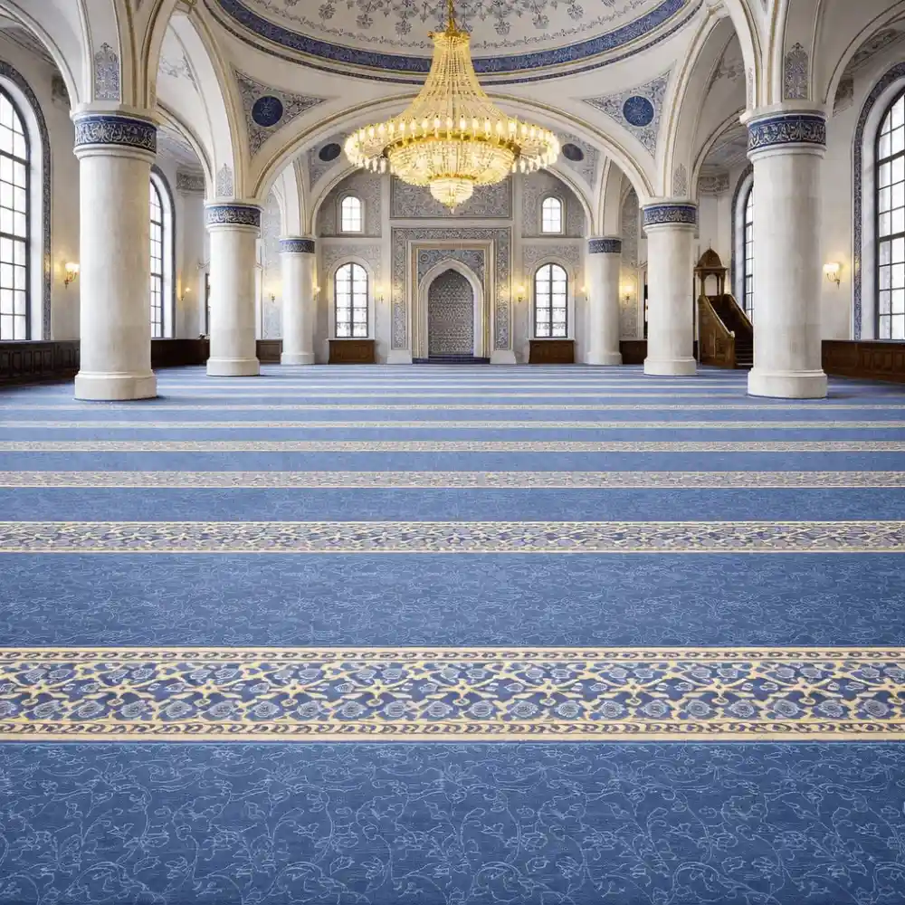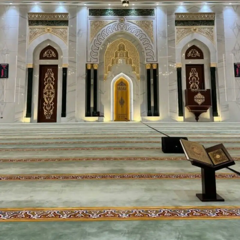 Our mosque carpets UAE come in custom sizes, colors and materials to achieve unique identity. Our designs follow Qibla alignment with traditional motifs.