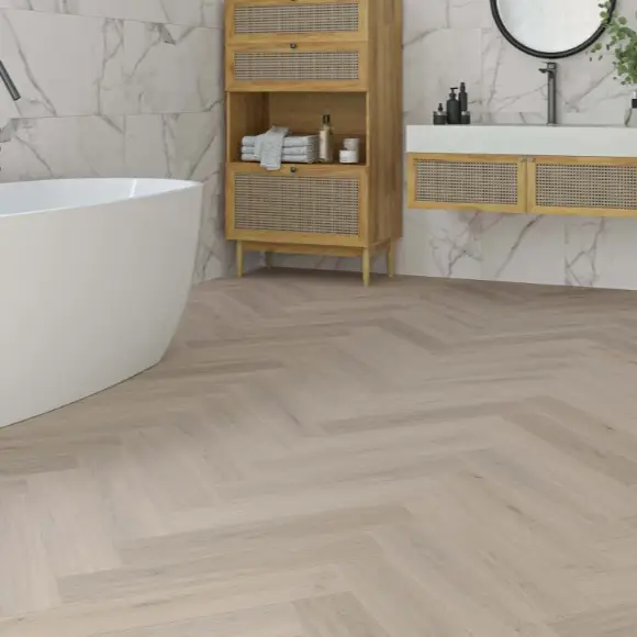 Classic Greige Herringbone Click Vinyl blends timeless herringbone style with modern durability. Featuring soft grey-beige tones, a realistic wood texture, and an easy click-lock system, it’s water-resistant, low-maintenance, and perfect for stylish everyday living spaces.